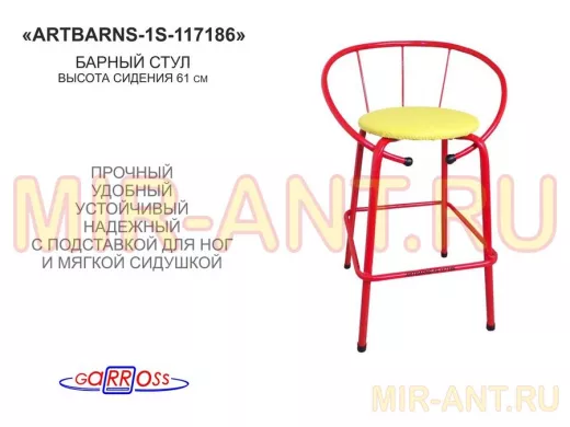 Барный стул "ARTBARNS-1S" органично дополнит интерьер модного заведения или домашней кухни. Стильная модель высотой 0,61 метра устойчиво стоит на четырех опорах с удобными подножками.