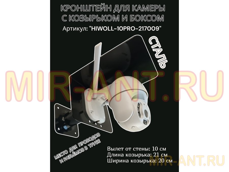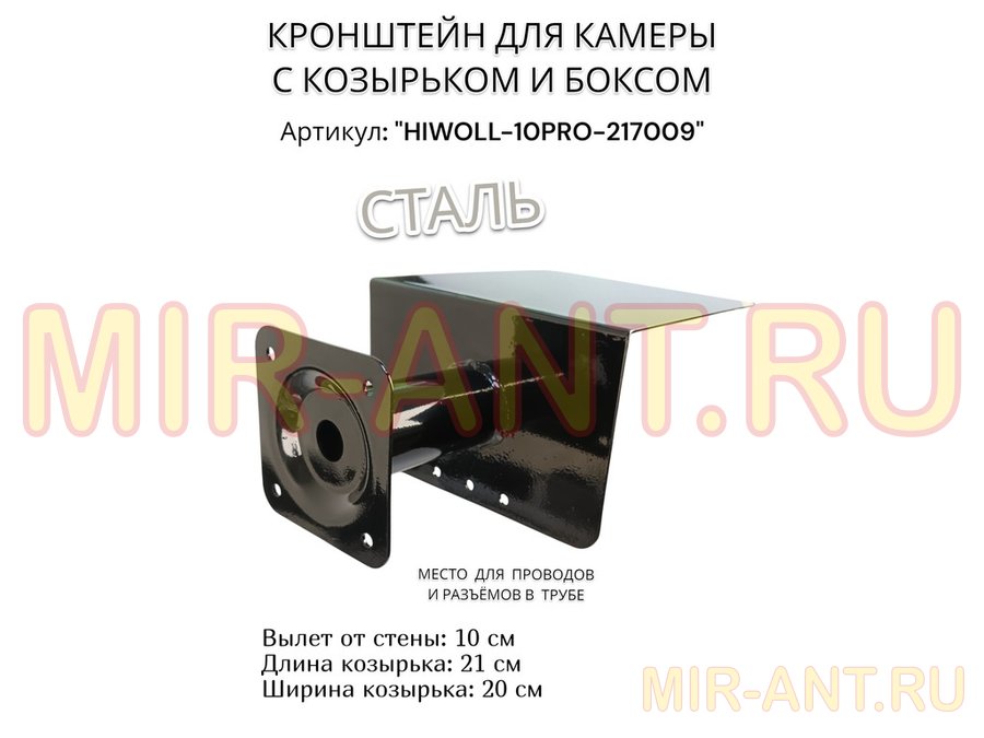 Стальной кронштейн с цилиндрическим боксом и большим козырьком для камеры видеонаблюдения "HIWOLL-10PRO-217009" черный, вылет 10см, козырек 21х20см