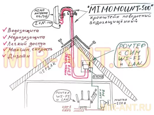 • Конёк крыши обычно является самым высоким местом здания, поэтому можно добиться наилучшего качества принятого сигнала, установив антенну в наивысшую точку