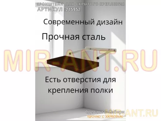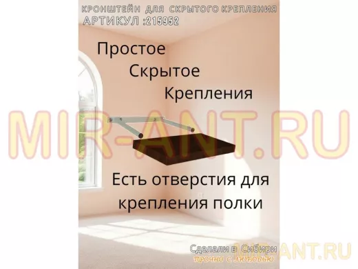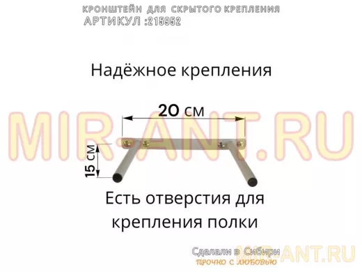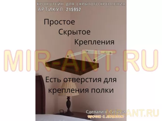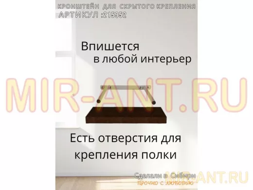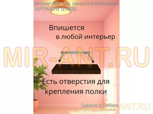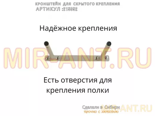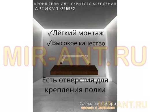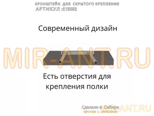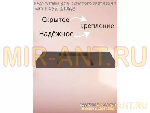 - Кронштейн предназначен для скрытого крепления полок, изготовленных из различных материалов: МДФ, ДСП, дерево, пластик.
