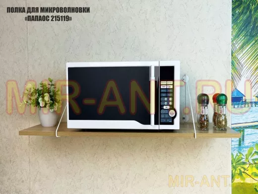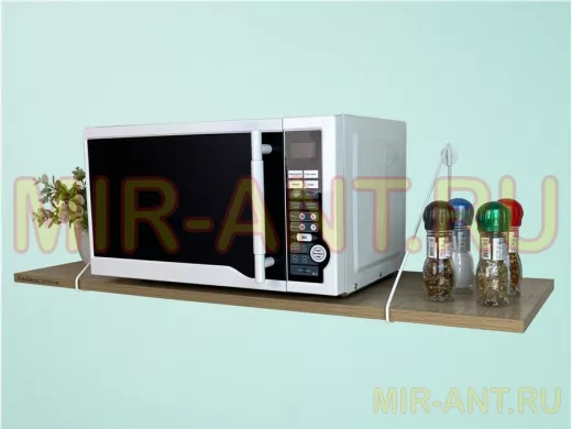 • Полка надежно крепится к стене при помощи анкеров или шурупов с дюбелями, на ней можно разместить микроволновую печь, кухонную технику, посуду, специи