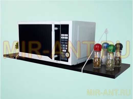 • Полка надежно крепится к стене при помощи анкеров или шурупов с дюбелями, на ней можно разместить микроволновую печь, кухонную технику, посуду, специи