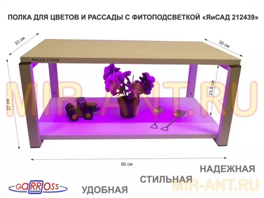 Полка для цветов и рассады с фитоподсветкой, высота 25см, серый "ЯиСАД 212439" 60х30, сосна - MIR-ANT.RU