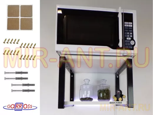 • Полка надежно крепится к стене при помощи анкеров или шурупов с дюбелями, на ней можно разместить микроволновую печь, кухонную технику, посуду, специи