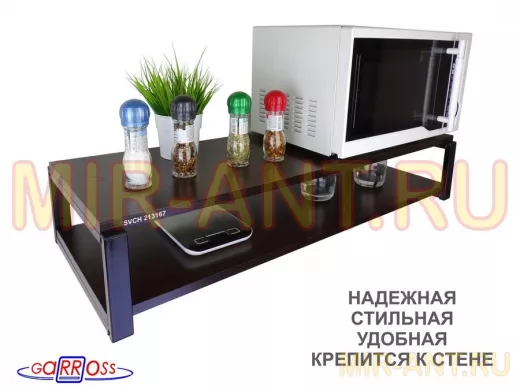 • Полка надежно крепится к стене при помощи анкеров или шурупов с дюбелями, на ней можно разместить микроволнрвую печь, кухонную технику, посуду, специи