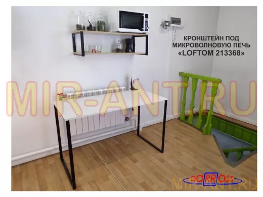 • Полка надежно крепится к стене при помощи анкеров или шурупов с дюбелями, на ней можно разместить микроволновую печь, кухонную технику, посуду, специи