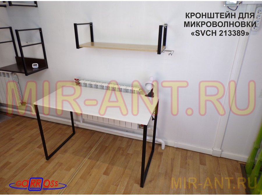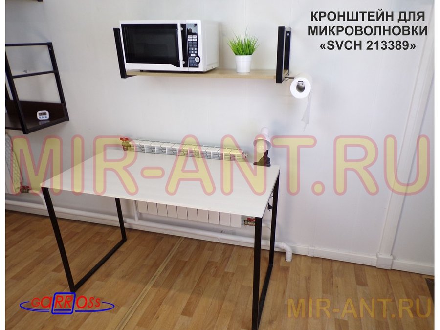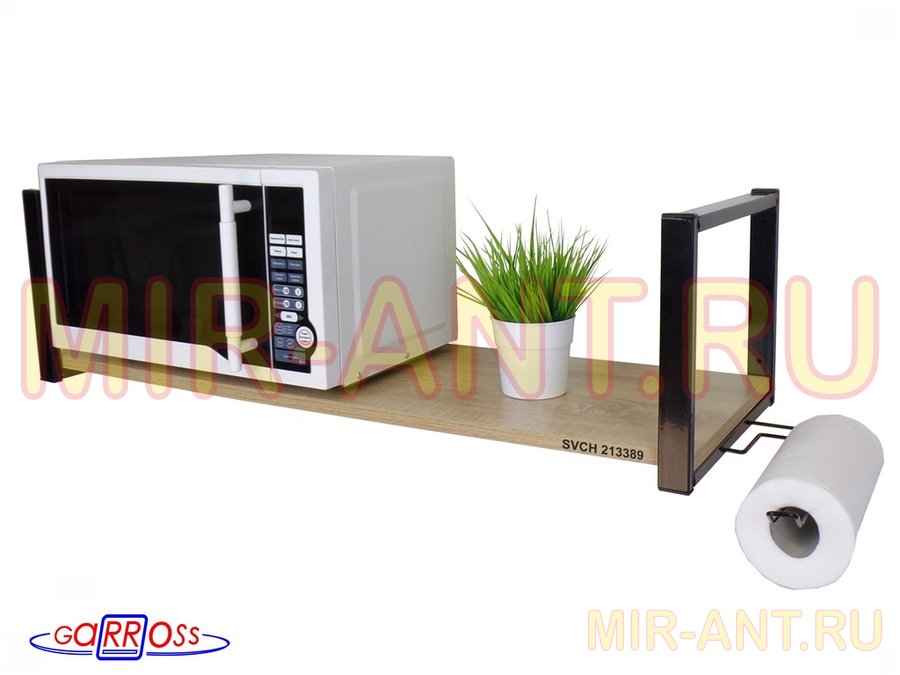 • Полка надежно крепится к стене при помощи анкеров или шурупов с дюбелями, на ней можно разместить микроволновую печь, кухонную технику, посуду, специи