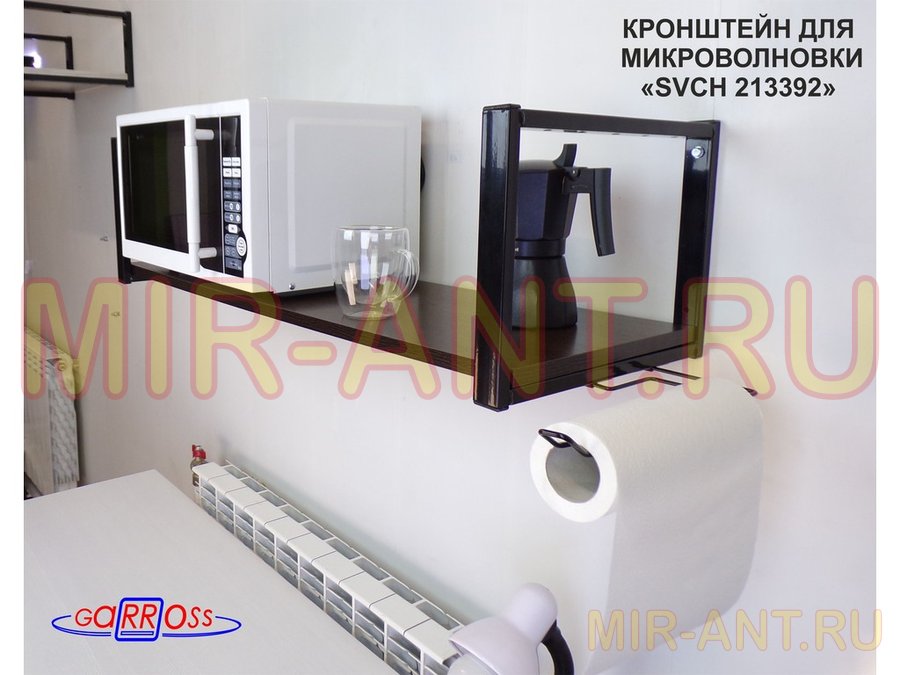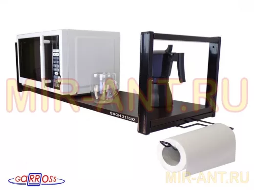 • Полка надежно крепится к стене при помощи анкеров или шурупов с дюбелями, на ней можно разместить микроволновую печь, кухонную технику, посуду, специи