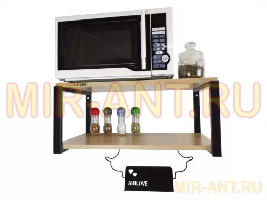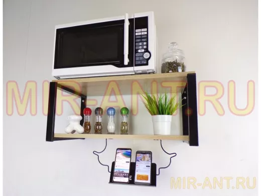 • Полка надежно крепится к стене при помощи анкеров или шурупов с дюбелями, на ней можно разместить микроволновую печь, кофемашину, тостер идр.кухонную технику, посуду, специи, различные необходимые мелочи