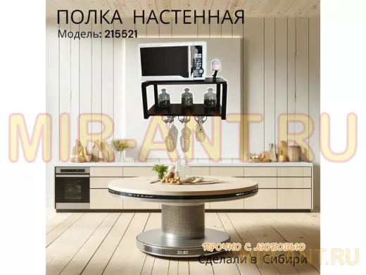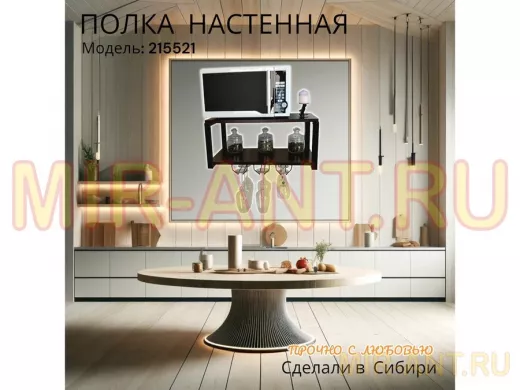 • Полка надежно крепится к стене при помощи анкеров или шурупов с дюбелями, на ней можно разместить микроволновую печь, кухонную технику, посуду, специи