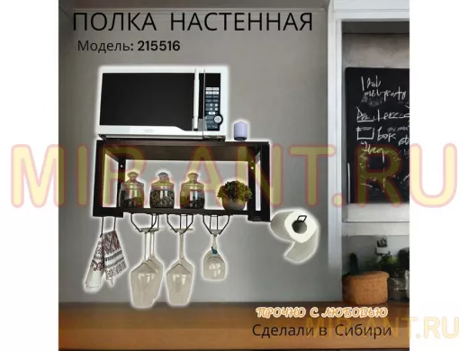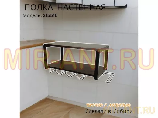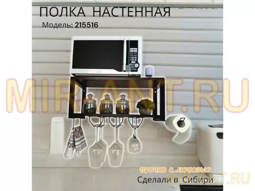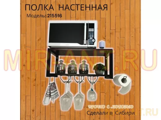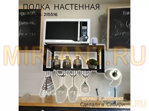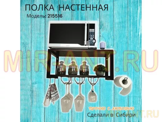 • Полка надежно крепится к стене при помощи анкеров или шурупов с дюбелями, на ней можно разместить микроволновую печь, кухонную технику, посуду, специи