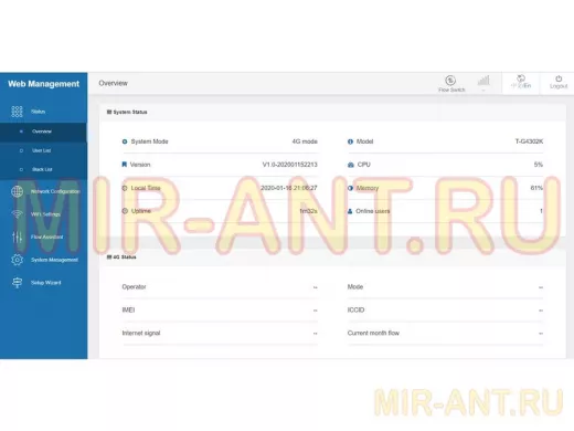 Предназначен для приёма/передачи мобильного интернета по сети 3G/4G и раздаче по Wi-Fi или LAN