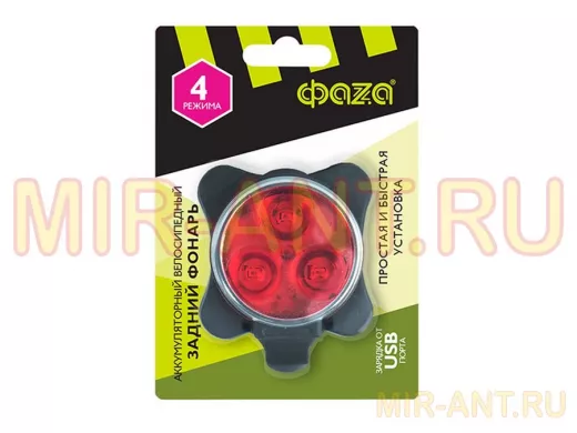 Фонарь ФАZA Accu BR3-L03 велосипедный (задн),USB, max яркость 12Lm, 4 режима работы, IP44, с литий-п - MIR-ANT.RU