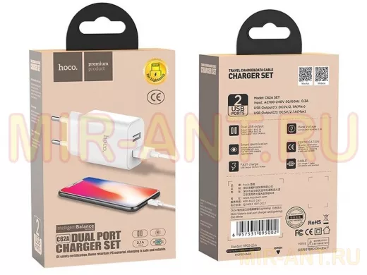 Зарядное устройство Lightning HOCO C62A iOS (5B, 2100mA) - MIR-ANT.RU