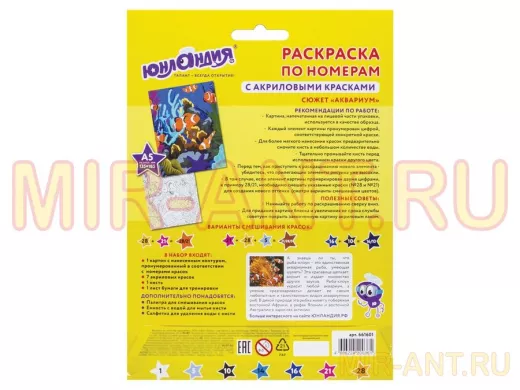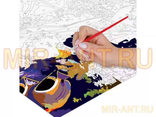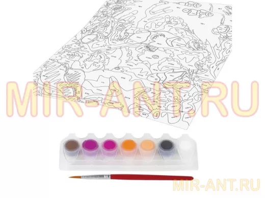 Комплектация: акриловые краски, картон с нанесенным контуром, кисть, лист бумаги для тренировки