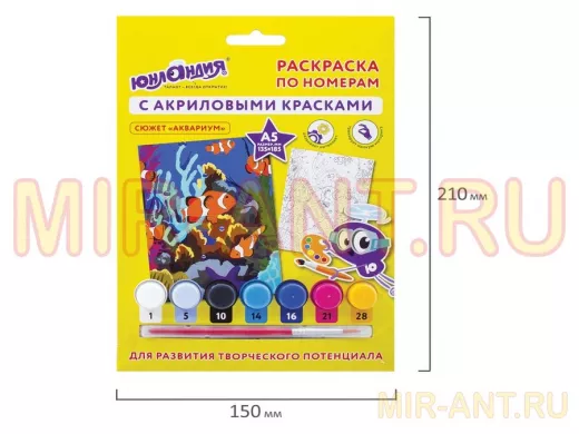 В набор входят: 7 акриловых красок по 2 мл каждая, лист для тренировки, картонная основа с нанесенным контуром формата А5 (210х148 мм), синтетическая кисть.