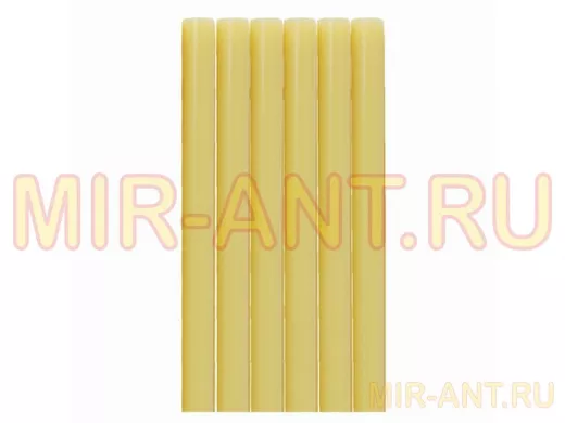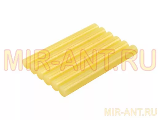 Термоклей прочно и быстро скрепит различные материалы: бумагу, дерево, картон, стекло, пластмассу, металл, кожу, синтетические волокна и т.д. Диаметр клеевого стержня 11 мм и длина 10 см являются самыми востребованными параметрами для выполнения работ. Цвет клеевого стержня - жёлтый. В комплект входит 6 клеевых стрежней, обеспечивающих непрерывный рабочий процесс.
