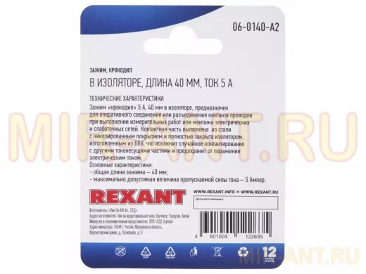 Зажим крокодил в изоляторе, длина 40 мм, ток 5A, (2шт. ) REXANT