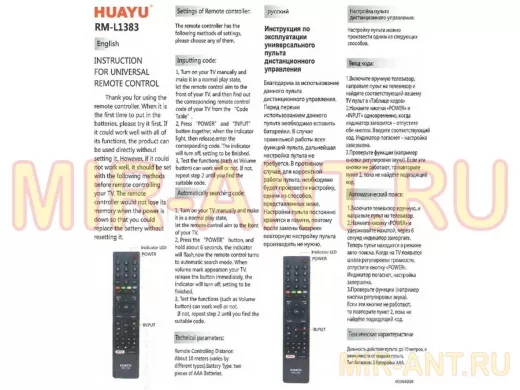 Пульт легко настраивается с помощью ввода кода, инструкция на русском языке и таблица с цветными изображениями поддерживаемых пультов в комплекте.