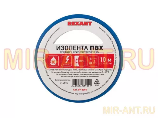 Изолента 15мм х 10метров синяя REXANT - MIR-ANT.RU
