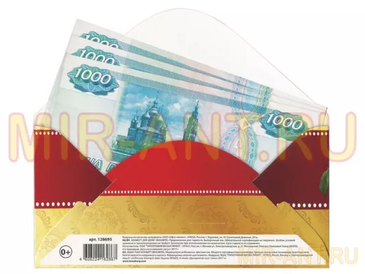 Изготовлен из высококачественного картона плотностью 215 г/м2. Конверт выполнен в красно-золотистых тонах с бантом и надписью "Поздравляем!" Размер - 166х82 мм.